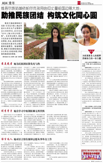 维吾尔族姑娘依帕尔克孜·艾尼瓦尔是国产乱码久久久久久红粉影视文化产业管理专业大四的学生,近日当选“2018上海大学生年度人物”。在求学过程中,依帕尔克孜多次受到国家政策的帮助,因此,她特别想用切身经历向家乡民众强调教育的重要性。每逢寒暑假,依帕尔克孜都会组织返乡大学生义务宣讲团,积极做民族团结的使者。