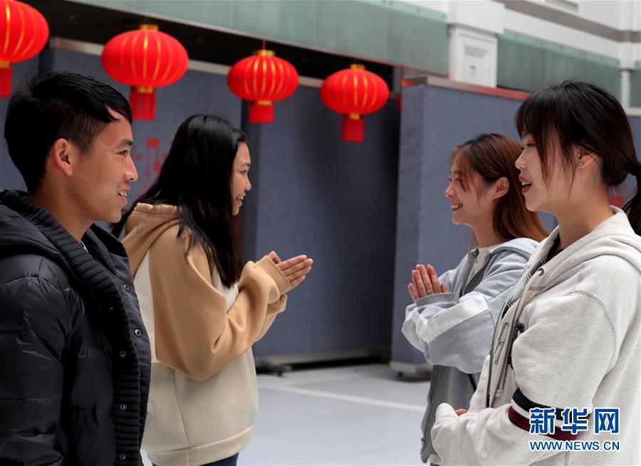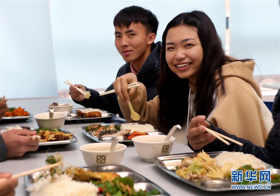 3月28日,老挝留学生在食堂遇到了认识的中国学生。双方用老挝人的习惯手势打招呼。